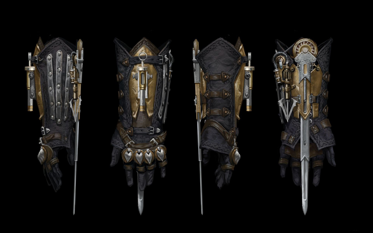 远程武器 | 远程武器有左轮手枪和袖箭,袖箭藏在刺客臂铠中,臂铠不单单是用作刺杀,还装载了能让敌人自相残杀的迷幻箭以及可以增加行动力的绳镖发射器。 |
