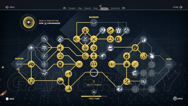 游戏中共有三种技能树,分别是先知(Seer),武士(Warrior)和猎人(Hunter)。玩家可以成为全能型的刺客,或者是专注在特定的能力上,例如将技能点数大量投资在战斗技能上,以强大的正面战斗能力来弥补其他的不足。除外玩家还能将技能主力投资在远程攻击上,让主角成为游侠般使用弓箭为主要战斗手段的人物。还有些技能可以让玩家驯服野生动物,或者是玩弄守卫来让任务过程更为容易,玩家有绝对的自由来决定要怎么玩游戏。 [25]