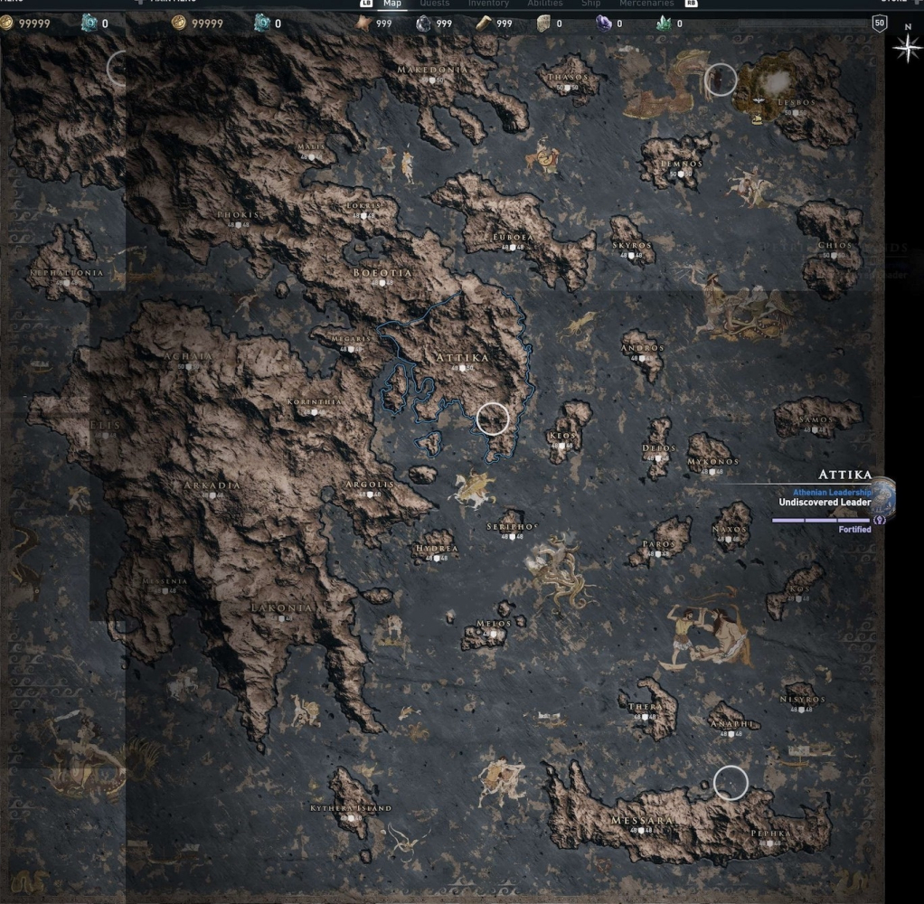 玩家可以通过船只、游泳等方式抵达各个区域。除个别区域外,大部分区域都可进行探索发掘。除此外,每个区域的地点将会以图标的形式进行体现,其中包含城市、村庄、圣殿、码头等区域。通过在世界地图内切换图标,可以查看在希腊群岛中已探索区域的历史地点,并进行简要介绍。