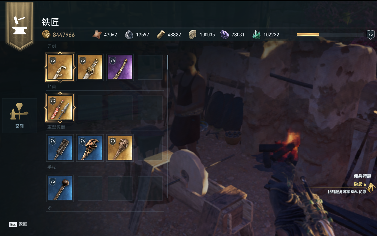 角色可以前往铁匠处进行武器装备的升级与铭刻。